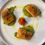 in crosta di mandorle, con tighe lombarde e composta di cipolle rosse di Tropea